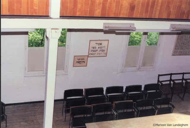 Binnenzicht noordelijke muur . Foto genomen staande op de gaanderij voor de vrouwen . Op de 2 platen tussen de 2 ramen staan enkele praktische zaken : "Verboden een boek mee te nemen zonder toelating van de gabaiem " (soort koster of beheerder ) en "Steun de synagoge". Foto 1990